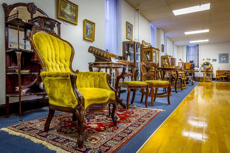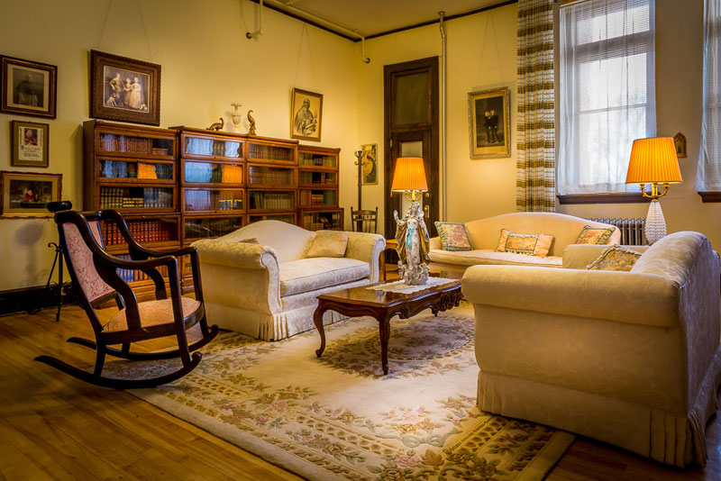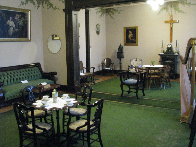 The Green Parlor depicts the heritage of the Ursuline Centre. This formal parlor with the original green rugs and green sofa reflect the era of civility when callers were entertained with culture and class. Elegant furnishings, a magnificant harp and beautiful pictures from days of yesteryear greet guests as they learn of the history of the Centre.
